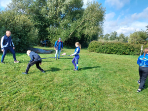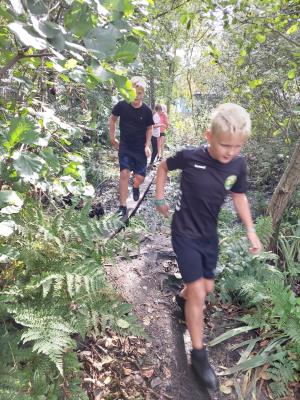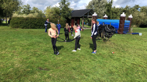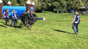 Dan is het tijd voor de samenwerkingsopdrachten. We splitsen op en samen met een figuur die zo uit een Kameleonboek zou kunnen komen stellen we ons bloot aan verschillende opdrachten. Er vliegen fietsbanden om een paal, er worden kruiwagens gevuld met water, er wordt gestereoplonst met vaten. En als je nu denkt.... ‘ik snap er niks van’... Tsja, had je maar mee moeten gaan!