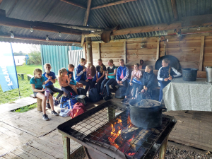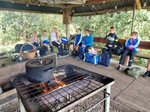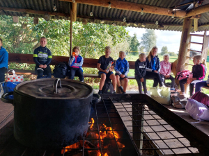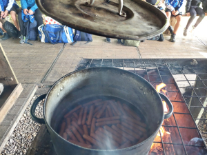 Na de training mogen we ons wagen aan de lunch. Het is een ‘doe’-lunch. Iedereen pakt een broodje met zijn eilandbestek (=blote handen). En pakt zelf de moeraswortels (=knakworsten) uit de pan die op een groot vuur staat. Ook mag je zelf een ei bakken met spek, die kun je keren met een omkeerding (=spatel) met een stukje multipapier (= wc papier) maak je vervolgens de pan schoon. Iedereen eet zoveel hij/zij wil. En de sfeer is prima! Gezellig. Het begint te lijken op het weekend wat we vroeger hadden op Ameland. We hebben lol. De groep begint steeds meer hecht te worden.